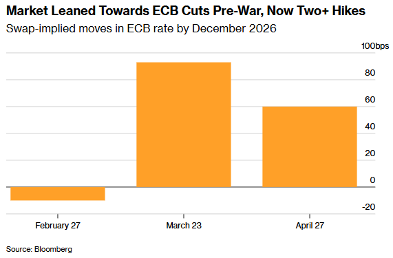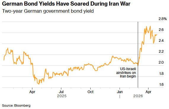 近几个月来,受中东战争引发的通胀压力影响,市场普遍预期欧洲央行将被迫大幅加息。对利率变化最为敏感的德国两年期国债收益率随之攀升至近两年来的最高水平。
