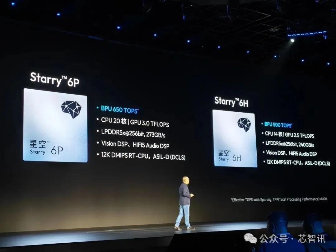 其中,“星空6P”基于尖端的5nm车规级制程,集成了自研的BPU 650 TOPS,20核心CPU,3.0 TFLOPS GPU,支持LPDDR5x@256bit,带宽达273GB/s。同时还拥有Vision DSP、 HIFI5 Audio DSP,12K DMIPSRT-CPU,通过了 ASIL-D(DCLS)认证。