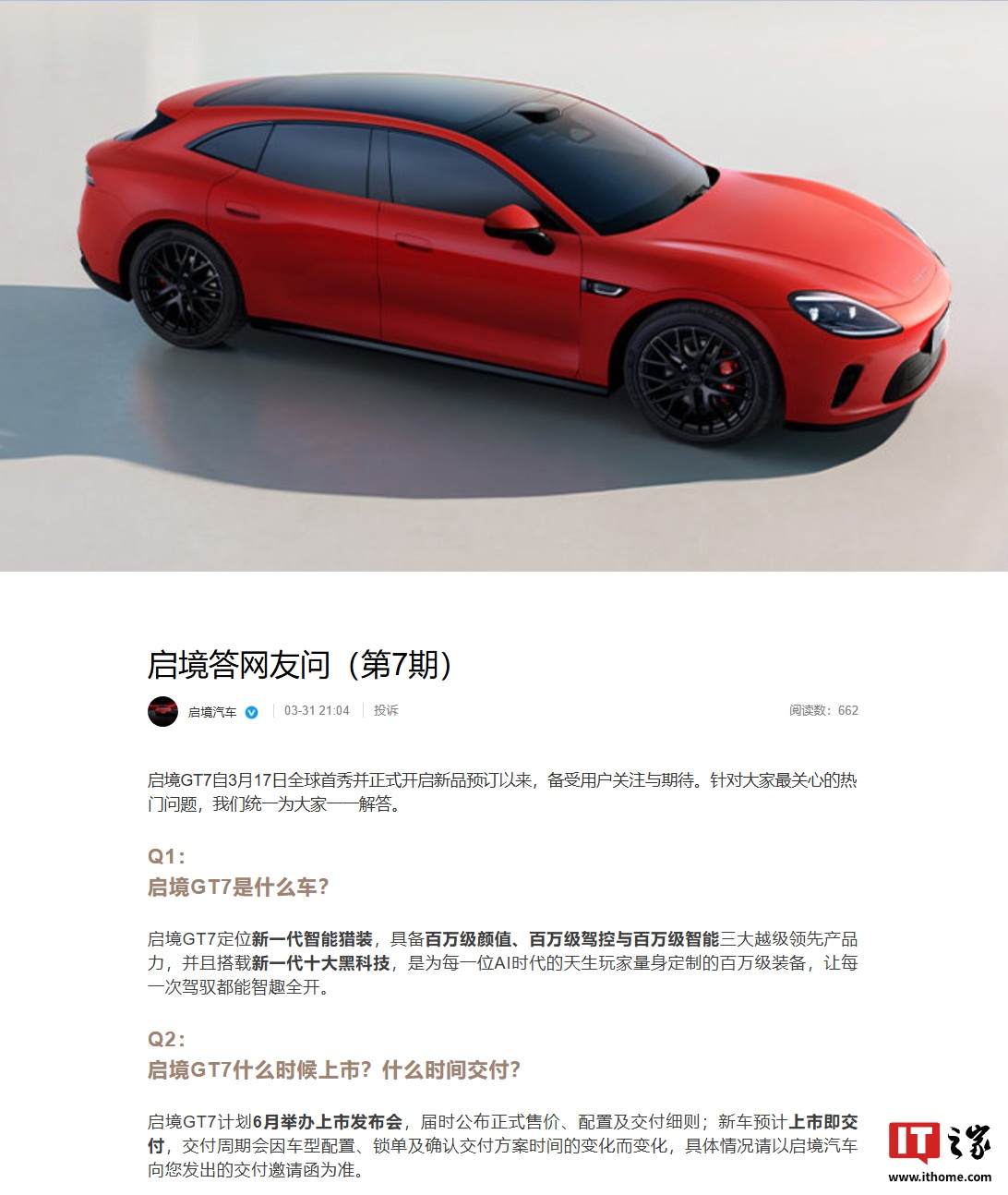 IT之家 3 月 31 日消息,启境汽车官方微博今日重新发布了答网友问(第 7 期),针对华为乾崑 | 启境 GT7 新一代智能猎装车上市交付时间安排进行了调整。